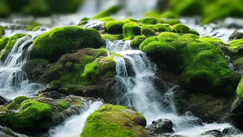 In a sealed timeless garden, a little green moss, questions the extent of the garden’s encompassing nature and ponders her own sense of lack. Dappled sunlight appears on tree leaves. The shimmering lights come together as voices guiding her, chanting “Let it manifest.”